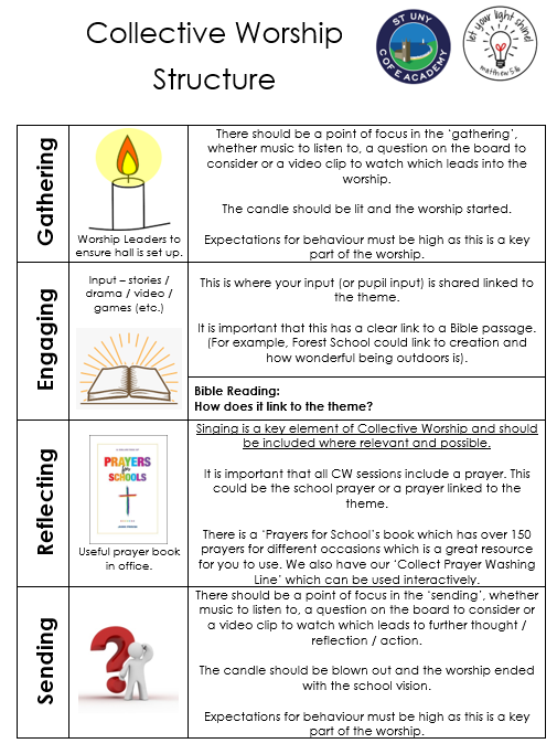 Collective Worship is at the centre of the school day at St Uny CE Academy and takes place at 1.30pm each day. It provides the opportunity for the school to meet together in a variety of contexts and to consider itself in terms of the great ideas and events of the world and be able to see its life and the lives of its pupils and staff as part of the rich tapestry of human experience and existence.